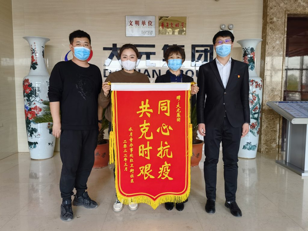 4月7日,沧州市水月寺街道红卫街社区书记张玉杰、红卫社区主任赵其昌向8xbet.COM_8xbet(中国)送来锦旗,8xbet.COM_8xbet(中国)副总裁、工会主席张春荣、人力资源管理中心总监齐平安接待。