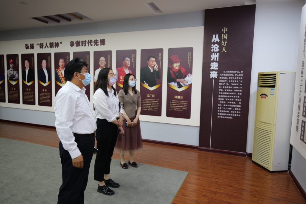 最后,袁仓立带领王艳凤一行参观沧州供电公司党建文化长廊,对企业发展历程、道德讲堂、沧电好人精神等内容进行讲解。