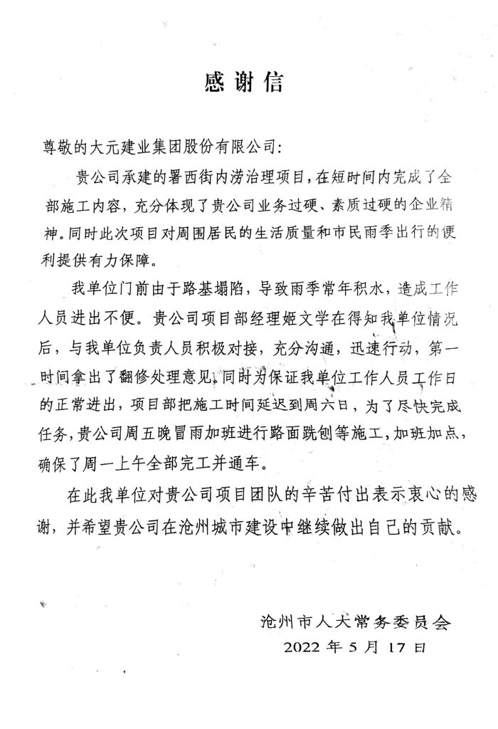 期间,路桥公司项目部在得知沧州市人大常委会门前路基塌陷严重,雨季常年积水等问题,立即组织人员进行施工,加班加点,利用周六日时间圆满完成施工内容,确保正常通行。5月26日沧州市人大常务委员会常务副秘书长袁洪君、主任宋欣燃代表人大向8xbet.COM_8xbet(中国)敬送锦旗及感谢信。8xbet.COM_8xbet(中国)党委书记、董事局主席李建国、路桥公司总经理孙红阁敬收。