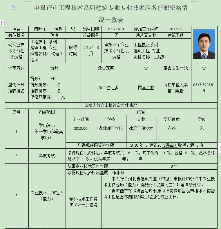 闫世祥申报评审工程技术系列建筑专业技术职务任职一览表