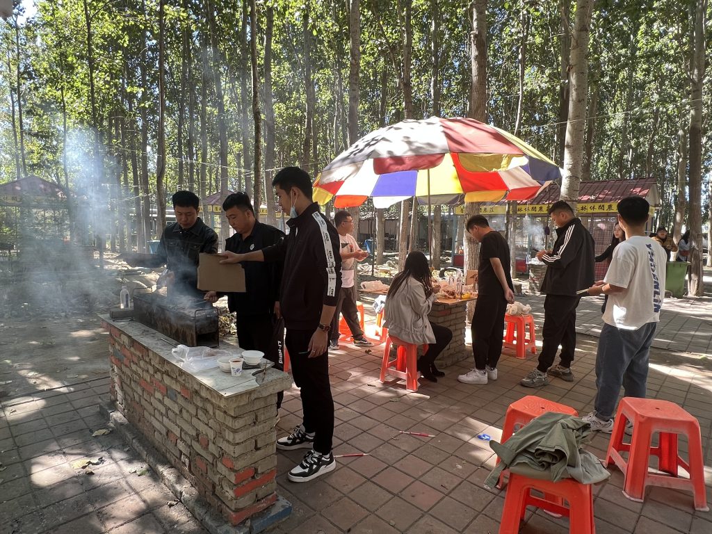 午餐环节,大家聚集在烧烤场地,按照预先的分组落座。领材料,加炭起炉子,准备烧烤,忙的不亦乐乎。大家边烤边吃、边吃边聊,更有青年临场发挥,主动参加歌唱表演,现场气氛洋溢着青春激情。