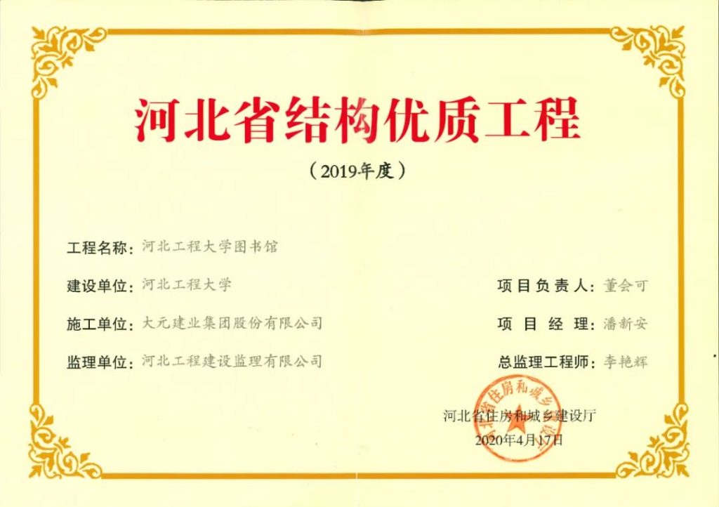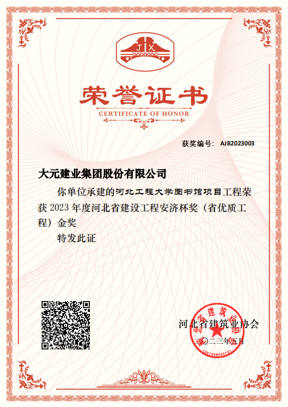 12月10日,2022~2023年度行业技术创新暨中国建设工程鲁班奖(国家优质工程)颁奖大会在北京举行,大会向获奖工程的承建单位授予鲁班金像。由大元建业集团股份有限公司承建的河北工程大学图书馆项目名列其中,大元建业集团董事长王连兴,大元建筑安装总公司总经理何立强赴北京会议中心现场领奖。