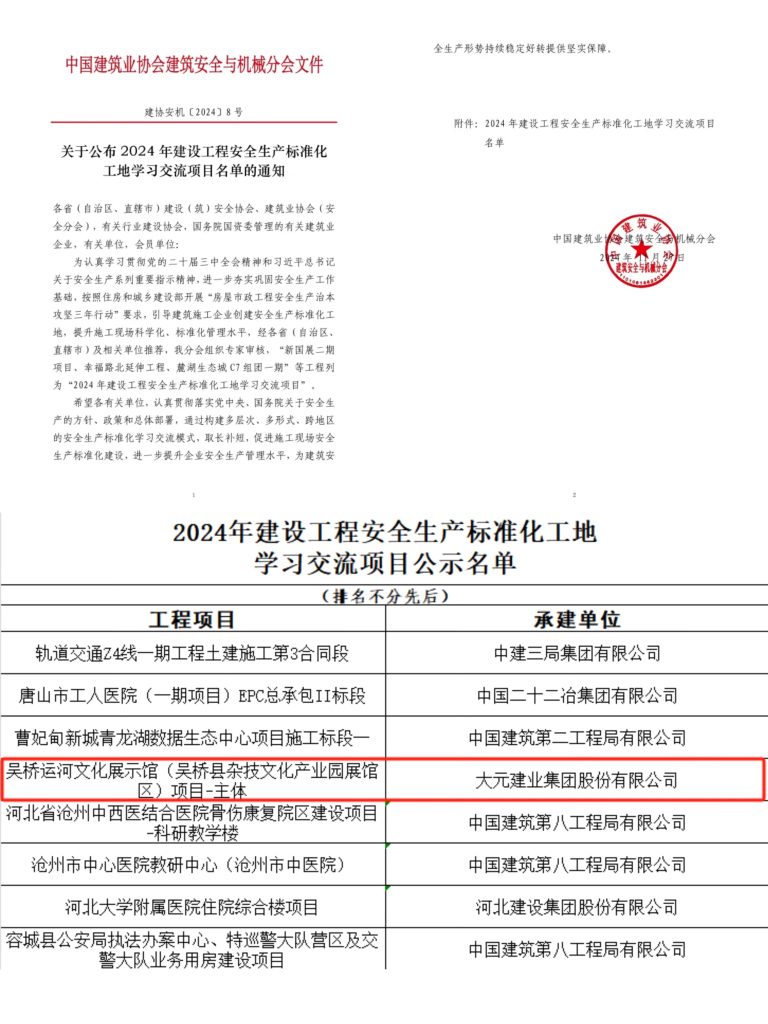 近日,8xbet.COM_8xbet(中国)承建的吴桥运河文化展示馆项目荣获“2024年建设工程安全生产标准化工地学习交流项目”称号(原“国家AAA级安全文明标准化工地”)。该奖项是全国范围内建筑安全文明施工的最高奖项,被誉为安全文明施工方面的“鲁班奖”。8xbet.COM_8xbet(中国)凭借严格的项目安全管理与文明施工要求,连续多年获此荣誉。