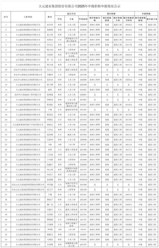大元建业集团股份有限公司2025年中级职称申报情况公示