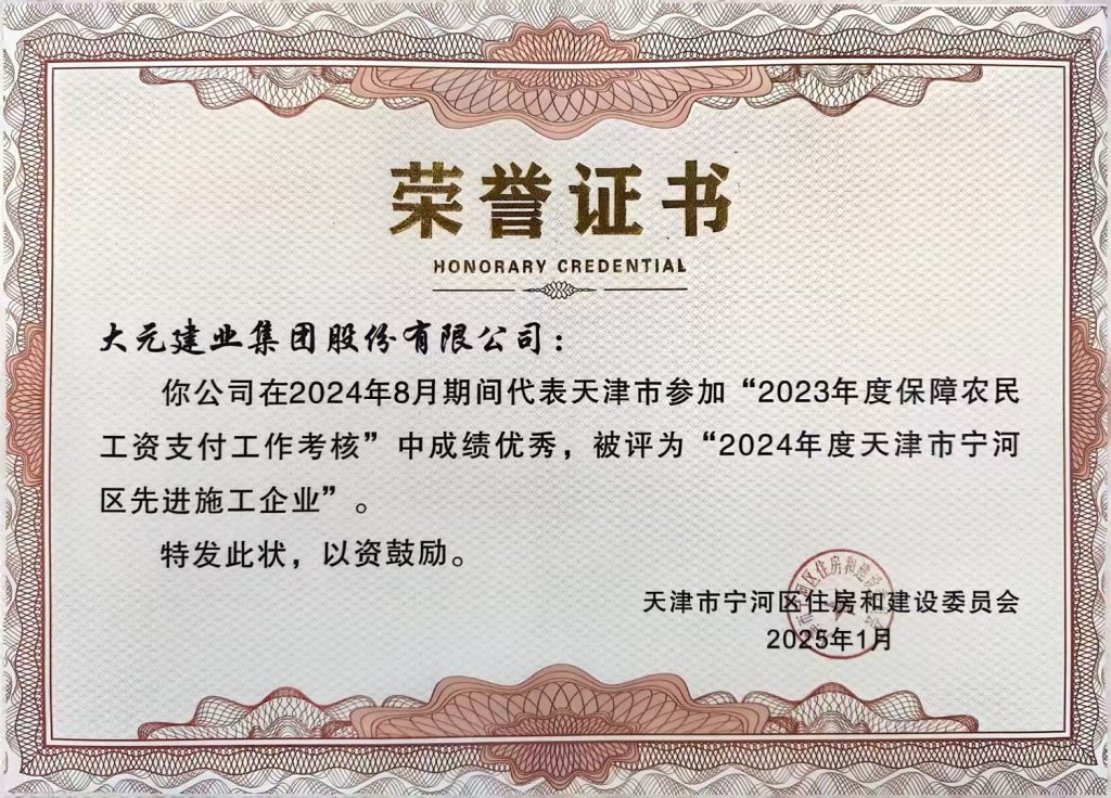 ]]> 11?0日,大元集团京津工程局承建的天津宁河安置房项目,凭借严格的实名制管理和完善的农民工工资保障体系,在国务院对省级根治欠薪工作整体情况的检查中表现出色,荣获“标杆项目”称号。为表彰大元集团在迎检工作中的突出表现,天津市宁河区人力资源和社会保障局向集团发出感谢信,宁河区住房和建设委员会授予集团?024年度天津市宁河区先进施工企业”荣誉称号?/p>
